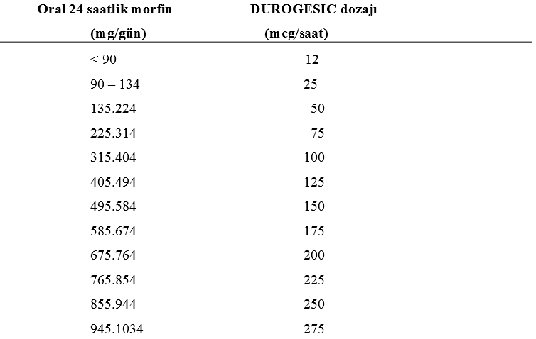 Tablo 2: Günlük oral morfin dozuna dayanarak önerilen DUROGESIC dozu1 (klinik olarak daha az stabil ve opioid dönüşümüne gerek duyulan yetişkin hastalar içindir: oral morfinden transdermal fentanile dönüşüm oranı yaklaşık 150:1’e eşittir)